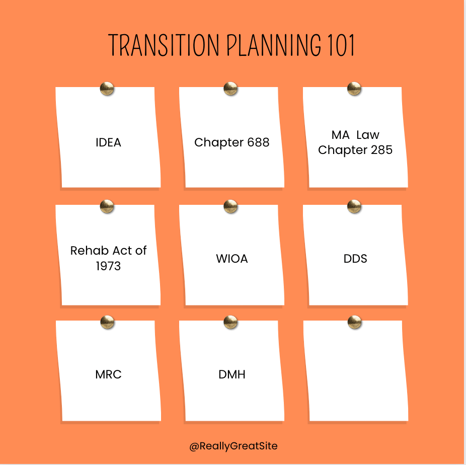 3. In Massachusetts, we also have the “Chapter 688 Law”, also known as the “Turning 22 Law”, which requires schools to refer eligible students to an adult service agency. In Massachusetts, those State agencies are MRC (Massachusetts Rehabilitation Commission), DDS (Department of Developmental Services), and DMH (Department of Mental Health). The DESE (Massachusetts Department of Elementary and Secondary Education) “Transition from School to Adult Life” website has a page dedicated to the 688 referral process, including brochures and referral forms: https://www.doe.mass.edu/sped/iep/688/