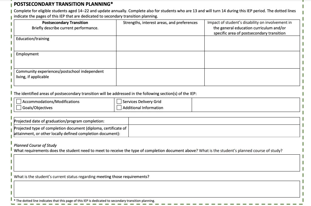 In this new form, they have made some updates as to where the information is within the IEP. The most significant change is that the transition form is now embedded in the middle of the IEP form instead of at the end. Pages related to transition planning will have a green outline around them. Let’s take a look at some of the parts of the new form.