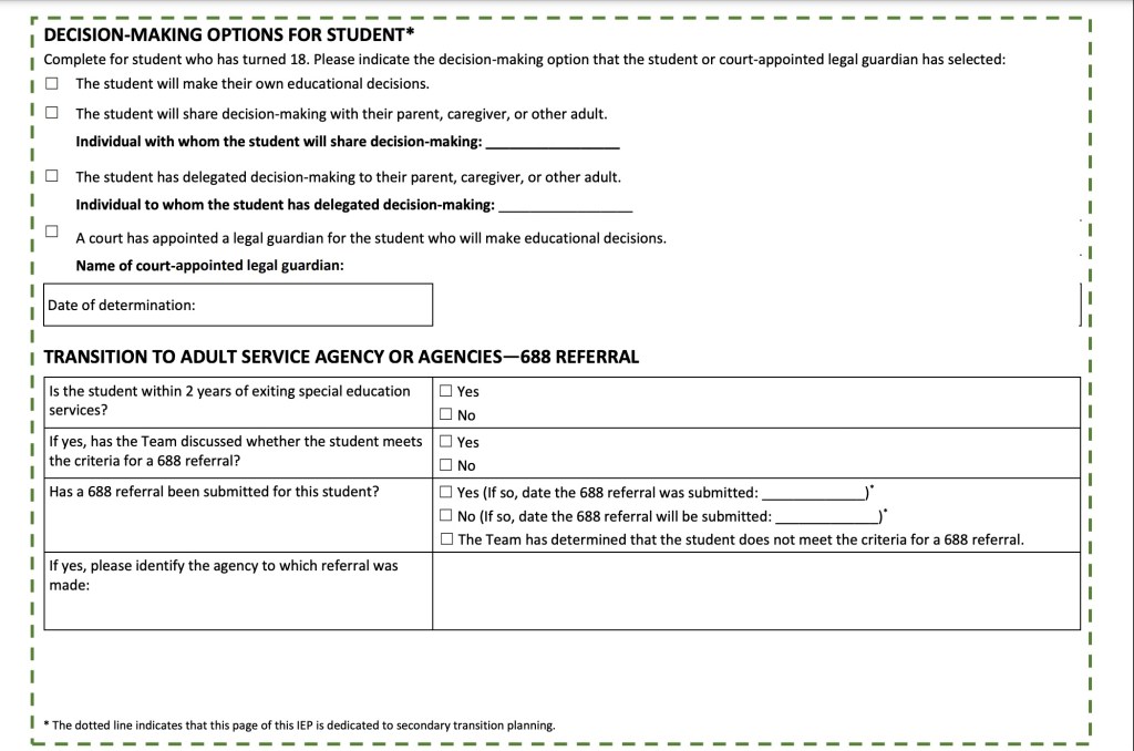 The other updated section is the “Transition to Adult Service Agency or Agencies–688 Referral”. In the various transition checklists that I reviewed in a previous blog post (click here to see it again), the 688 Referral is the form that the school generates at least two years before the student leaves school (whether via graduation or aging out) to apply to an adult service agency. Remember that adult service programs are eligibility programs, not entitlement programs. And just because your child may have received DDS eligibility as a child, it does not automatically mean that they will receive eligibility as an adult. This section clearly states what needs to be done and asks the team to check off the box to see if they have done it, and if yes, when and to what agency.