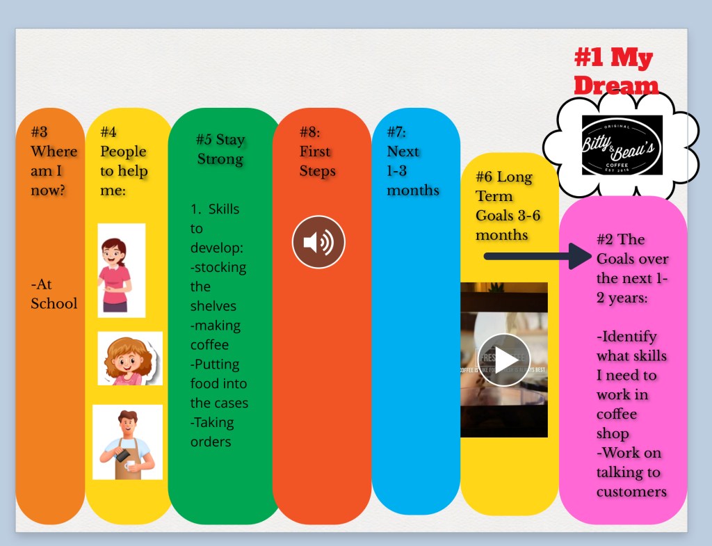 Once the students have used any of the above programs to fill in the PDFs that are part of the Charting the Life Course Framework, some students will take it a step further and put it all together into one document. L was able to do this while he was in school by creating a Google Slide deck, and we continued this method by having him transfer the information from his worksheets into a Google Slide deck for his ISP.
