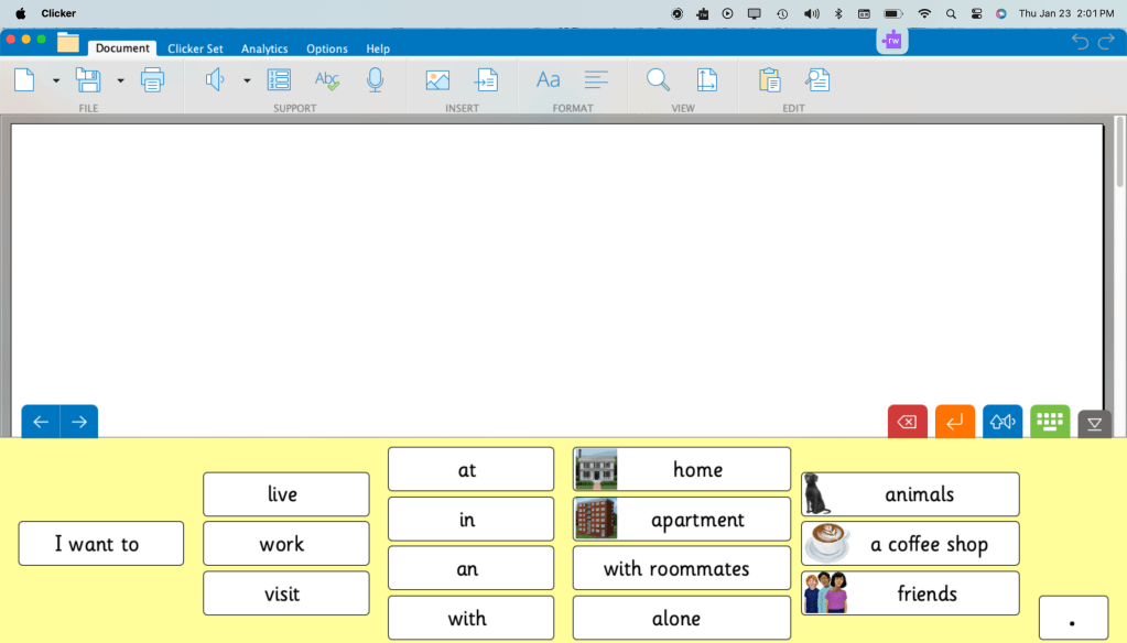 In this example, I created a Clicker Connect word bank. In the classroom or at home, the student would discuss with their team member the different areas of the person-centered plan, with the person writing down information that the student articulates. Then, the person will create the grids based on each section of the person-centered plan. The student then opens up the grid and uses it to create their sentences. You can have multiple grids within a grid set that the student can scan through and move around so they are not “locked” into one grid set at a time.